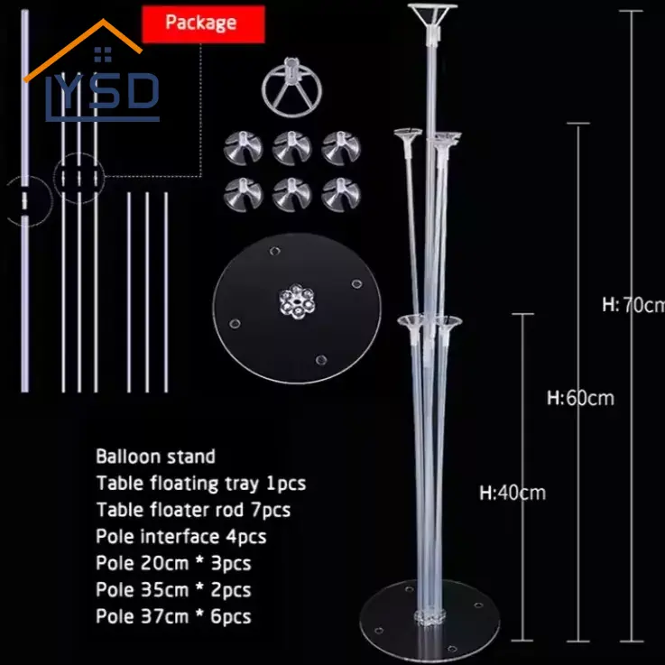 A léggömb tartó általában átlátható. A halmozott léggömbök általában merevnek tűnnek. Az YSD átlátszó léggömb tartója nem csak egy magasság. Különböző hosszúságúak vannak egy ballontartó sorozatban. Például a legjobb, amit eladunk, a 70cm, 60 cm és 40 cm kombinációja. Van egy 70 cm, 3 60 cm és 3 40 cm. Ezeket léggömbökkel kombinálják, hogy a léggömbök szétszórtak és rendezettek legyenek. Ezt a "szakaszos" hatást teljes egészében ezek a különböző hosszúságú átlátszó állványok érik el.