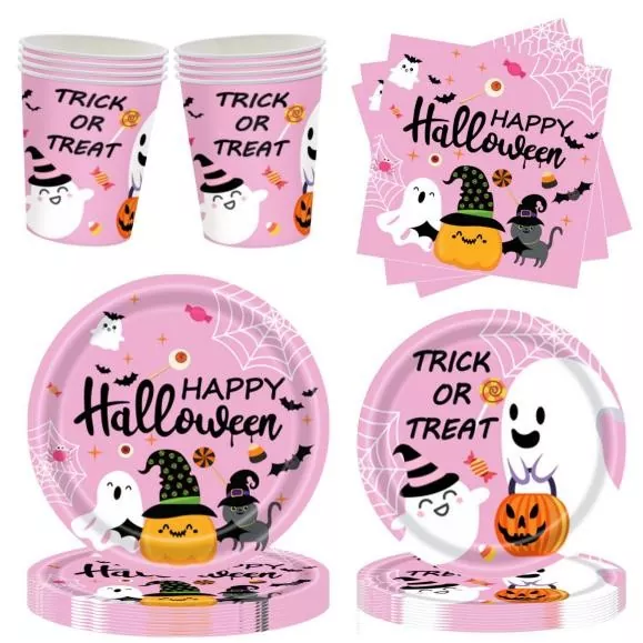 A Halloween eldobható asztalkészletek általában olyan alapkonfigurációkat tartalmaznak, mint például a tányérok, a poharak, a szalvéták, a kések, a villák és a kanál, és az összes elemet megkülönböztető Halloween témával tervezték. A gyakori minta elemek közé tartoznak a klasszikus képek, például a vicces tök lámpák, a titokzatos fekete macskák, az úszó szellemek, a pókhálók és a koponyák. A színek elsősorban az ünnepi narancssárga, fekete, lila és zöld, és a rejtély és az öröm erős Halloween hangulatát teremtik.